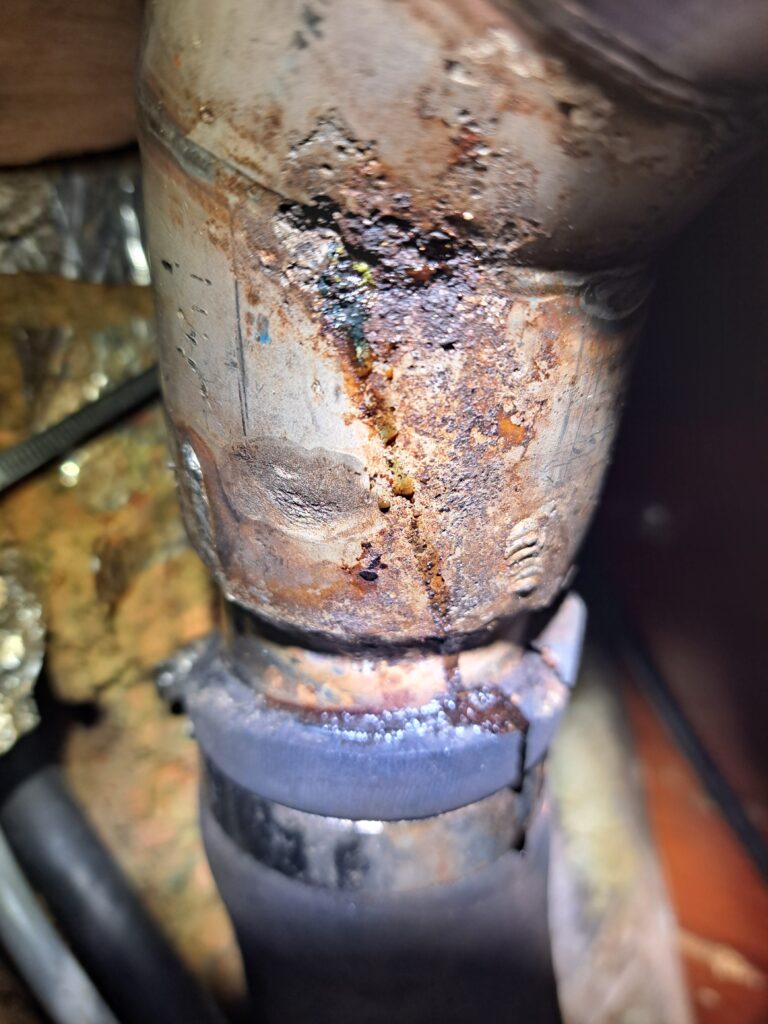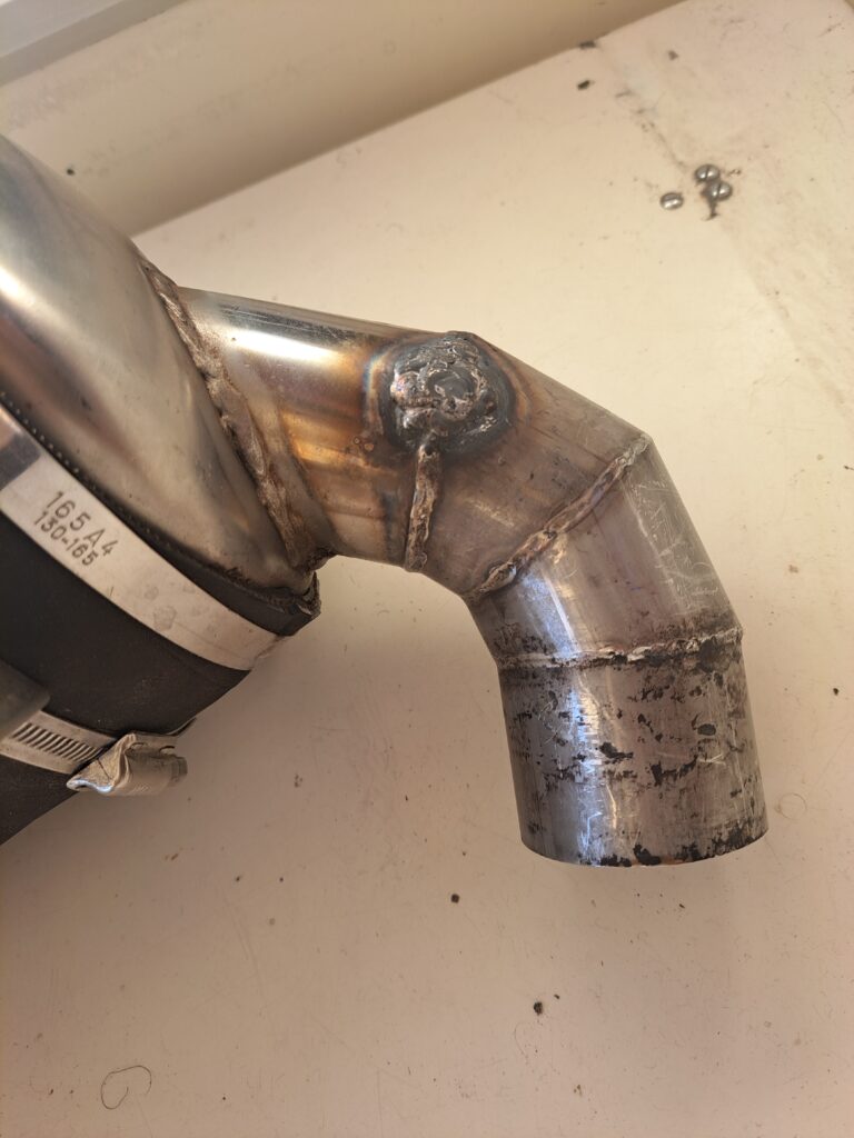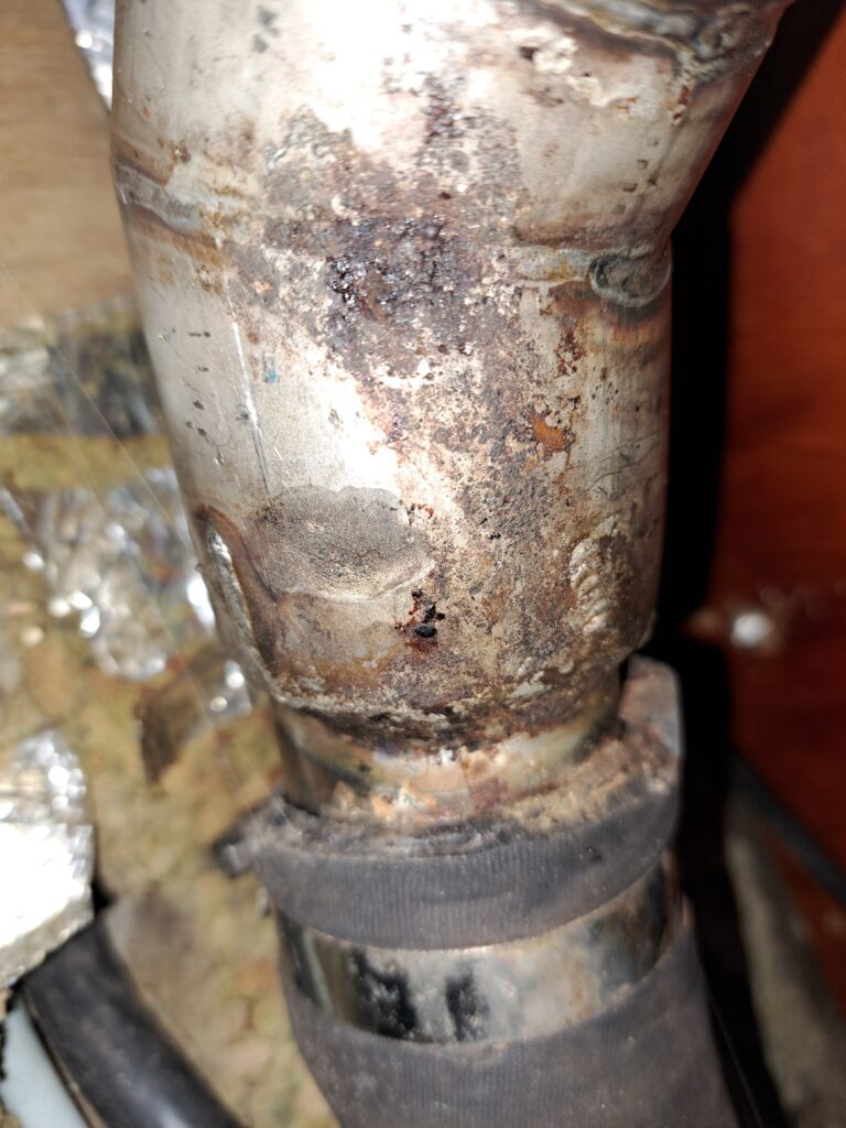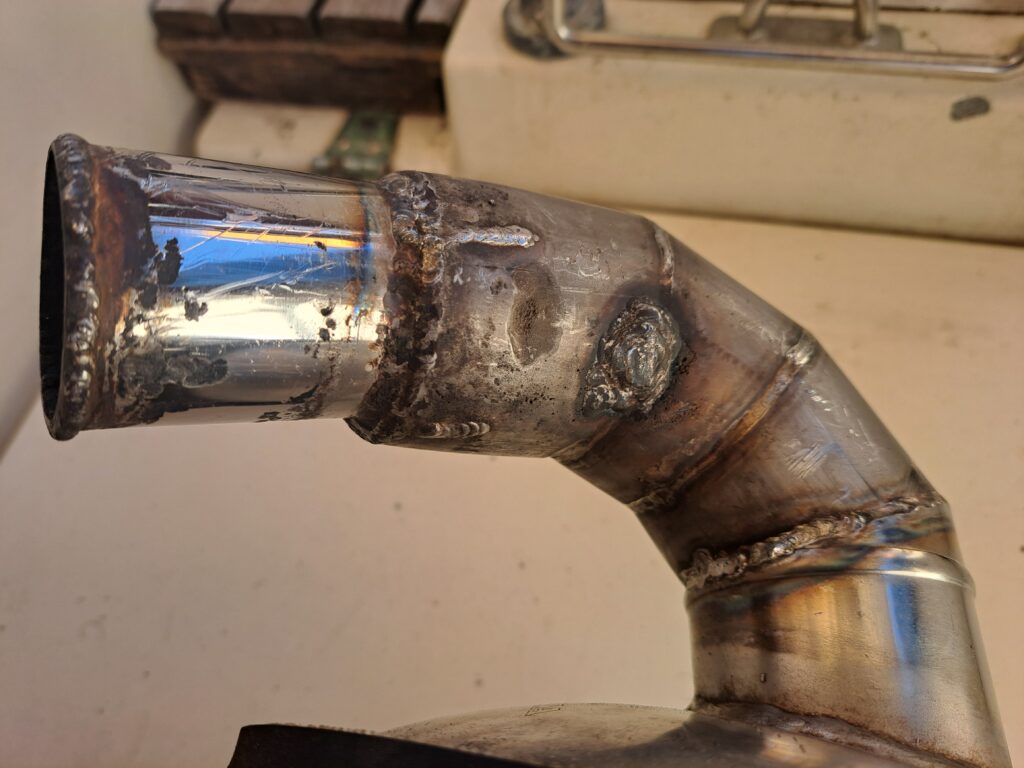 During our routine checks when we were in Germany we noted some corrosion on the stainless steel pipe that is welded to the actual exhaust gas silencer. Since then, we kept looking at it regularly to follow the progression. As the corrosion has worsen quite a bit, we decided to remove it in order to have it repaired in some local workshop. They did a simple repair, grinding off the corroded areas and rewelding over it. We’ll see how far it holds.