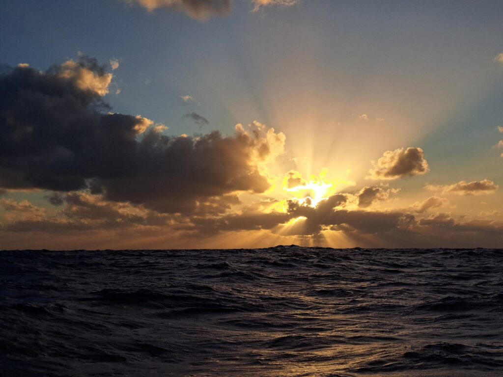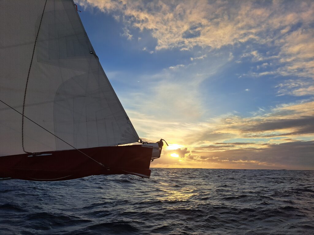 Day 3 started like Day 2 with another beautiful sunrise and strong winds but these started to decrease with the hours passing by, leaving us at some point with only very little wind. But the waves were still there. We spent the entire day to follow the wind changes, changing sail combinations to try to make our day looking better that just a day rolling around. During Day 1 and Day 2, we managed to keep an average speed of 6.2 knots that is very good for Lovisa. Day 3 destroyed that performance. At around 23:00, with winds decreased as much as to 3.5 m/s so we decided to start the engine to continue make some miles and reduce the rolling. We ran on engine for about one and a half hours until the wind picked up again from 3.5 m/s to 11-12 m/s, allowing us to stop the engine and get back to what we came here for, that is to say sailing! The time on engine was actually a good opportunity to recharge the batteries of the boat a bit. They had decreased from the 98% we had when we left Cascais to 92%.