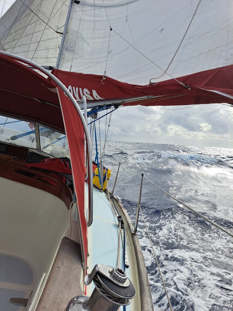 Tuesday September 23rd 15:40. Here I am again, contemplating the waves. Yesterday, I did not write, it was a terrible day and the word that came to mind was torture. The wind decreased and the sails were not stable in the waves that were still there. Not at all good for the sails. We tried everything, genua alone, main sail alone, both sails with genua in the same or opposite direction as the main, with or without poling the genua. A solution could work for some time but then winds changed. In the end, during my first night watch we took down the sails and went by motor. I was afraid not even that would work, because before when we used the motor to hoist or douce the mainsail, it sounded strange because the boat was heeling and rocking. But now it was fine. Later, the wind increased again and Emilien started sailing again during his watch. Today is a whole other day! All remains of sea sickness is gone for both of us. The wind has been good almost the whole time, and we have been able to relax and just be. It is so lovely to sit down and watch the waves. It feels like something is peeled off the soul, and all that remains is simplicity.