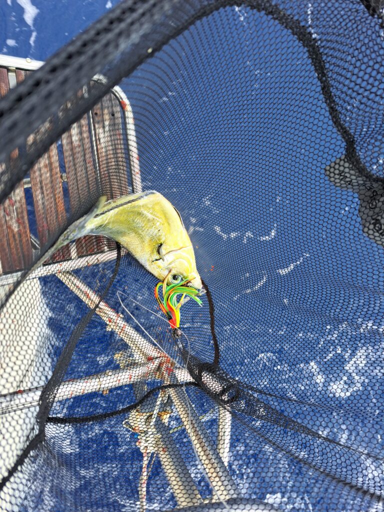 Day 4 marked a new turn in our sailing trip. We caught our first fish! A “Mahi-mahi” in French or English or a “Guldmakrill” in Swedish or “Pesce capone” in Italian. The question that arose as soon as we got the fish onboard was … “is it actually eatable”? At that point we had no idea what fish it was. It looked good but we didn’t want to take the risk of eating something we shouldn’t. Therefore we took a picture, cleaned the fish well and stored it in the fridge until we would get internet connection to confirm what it was.