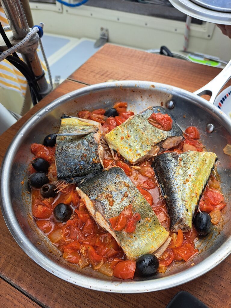 Our first fish finally ended up on the menu for our first lunch on anchor in front of the beach of Porto Santo. We cooked it in a simple sauce with cherry tomatoes, olives and onions with potatoes and salad. Delicious!