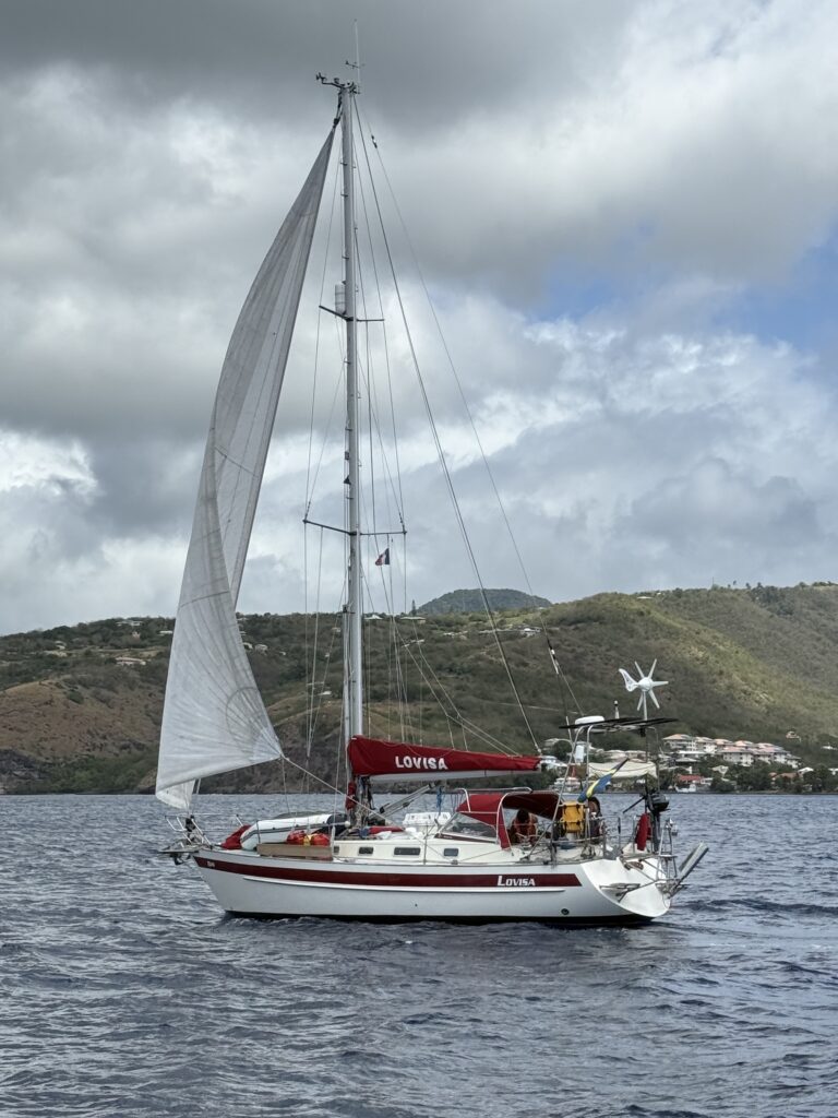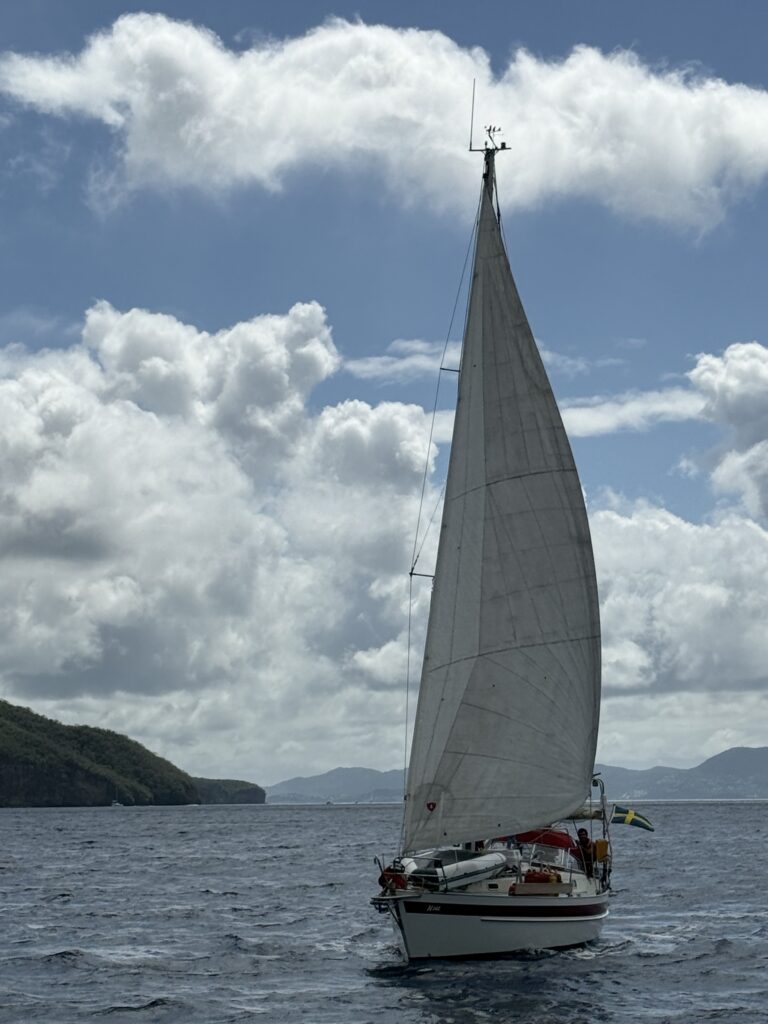 Lovisa sailing along the coast of Martinique towards Saint Pierre. Photo taken by Gunilla on S/Y Alba.