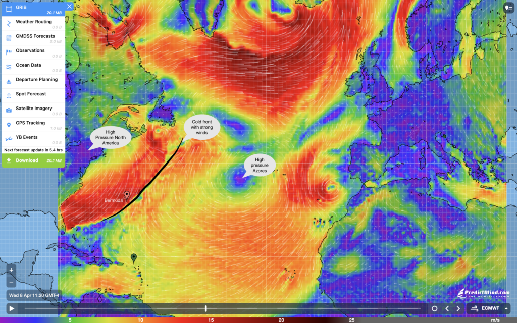 We are not meteorologists so we had to study quite a bit to understand how to build our plan in best conditions. For our first leg towards Bermuda, we need to wait for the temperatures over North America to increase. The winds driven by the semi-permanent high pressure system of the Azores get warmer as they travel through the lower latitudes. Regularly this warm air will meet the colder air that is circulated by another high pressure system that comes from North America. The meeting of these two generates cold fronts characterized by strong winds that have a direction that is very unfavorable for getting to Bermuda. These strong winds also bring heavy seas that we would rather avoid. The frequency and the intensity of these cold fronts will reduce as the air coming from North America will get warmer, allowing better sailing conditions to reach Bermuda.
