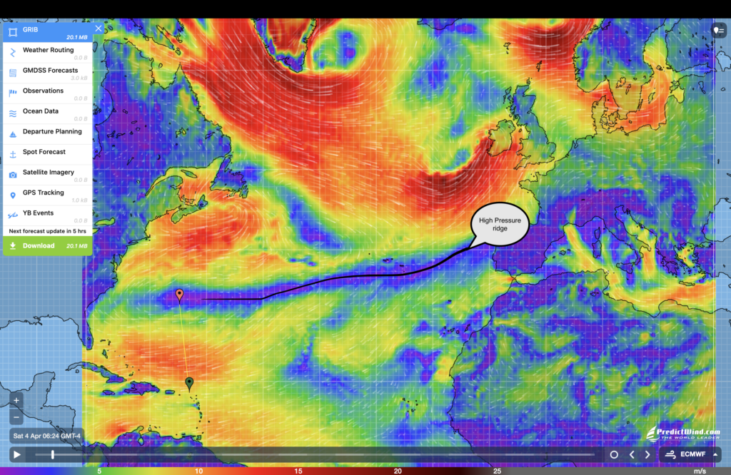 Another important phenomenon we will have to keep an eye on is the high pressure ridge, an extensive area of calm that often appears over the Atlantic Ocean. There are two ways to get out of one: wait for the ridge to move which can take several days, or run the engine to get out of it, making sure to use the fuel to reach areas with stable wind conditions even if this adds distance to the destination. This ridge is important mostly for the leg from Bermuda to the Azores because it is a longer leg and the risk is higher of getting stuck in one of these.