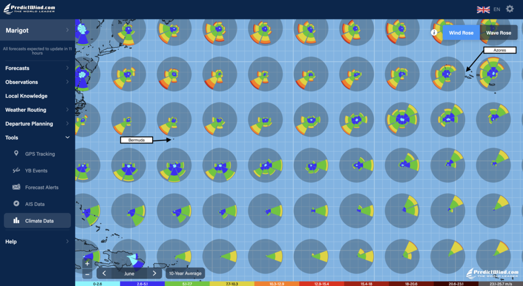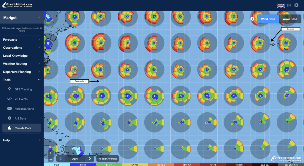 The statistical weather data that are also available via PredictWind tell a little bit the same story. The climate data tool of PredictWind represents the likelihood of encountering winds from a certain direction and with a certain strength as polar diagrams on the map. We show the ones for April, May and June below.