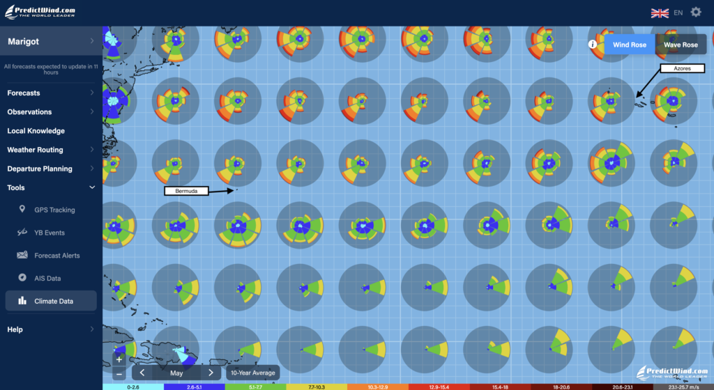 For the first leg from Saint Martin to Bermuda, these diagrams show that statistically, from April to May, the risk to face strong winds from the north drops dramatically and this is why May is statistically a better month for departure than April and the months before. This doesn’t mean that a departure in April is impossible, it is just statistics, and weather windows could turn up in the forecast.