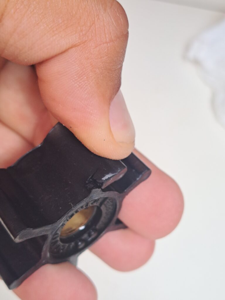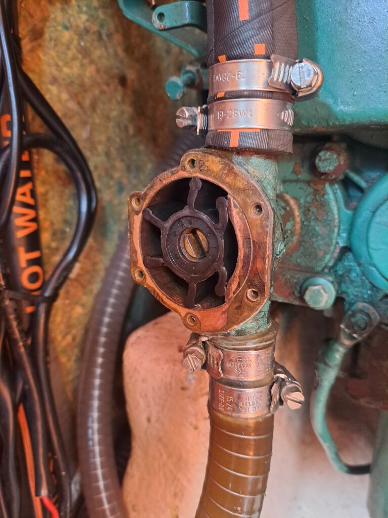 The impeller of the sea water pump ran for about 120 hours since the first replacement we did in Cascais so it was time for a second replacement in preparation for the Atlantic crossing as we might need to motor a lot. The impeller that we removed was still in one piece with some cracks. It looked quite similar to the one that we replaced in Cascais. Right timing for replacement!