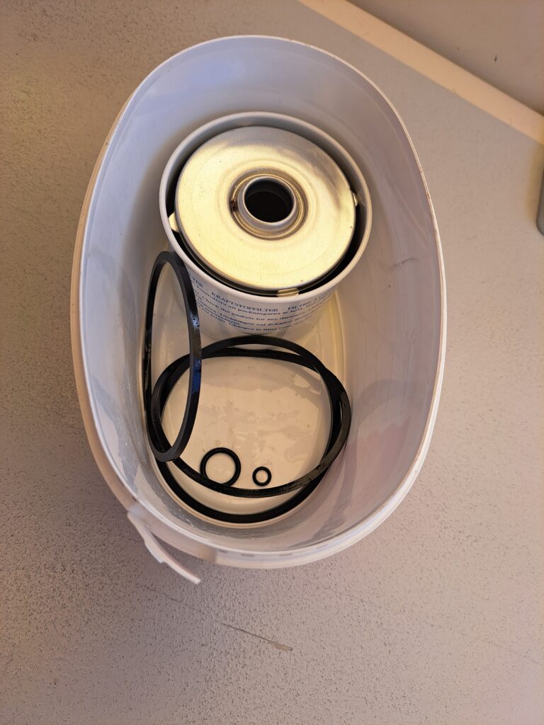 In Lanzarote, in preparation for the Atlantic crossing, we replaced the diesel fine filter. Not because we needed to but for peace of mind. However we didn’t replace the CAV filter because we have a duplex filter so if one filter is clogged we can switch quickly to the second one.