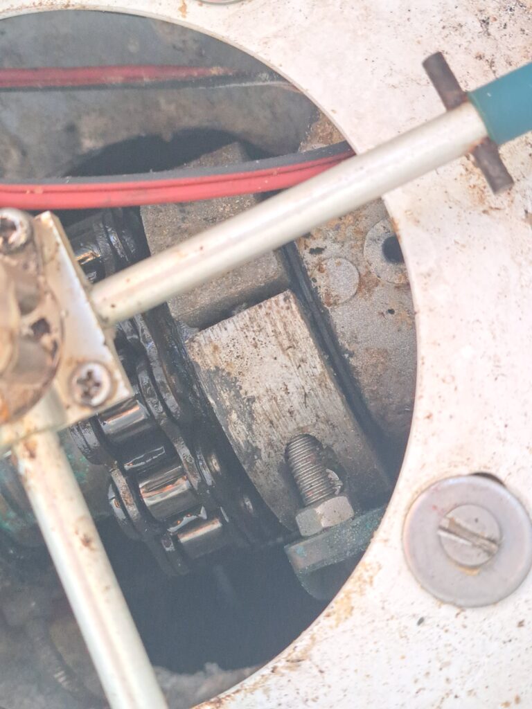 Some time passed since last time we pressed grease into the rudder shaft box. We could see tiny drops of water around the rudder pack box indicating that some water managed to pass through. That was indication that it was time to press new grease.