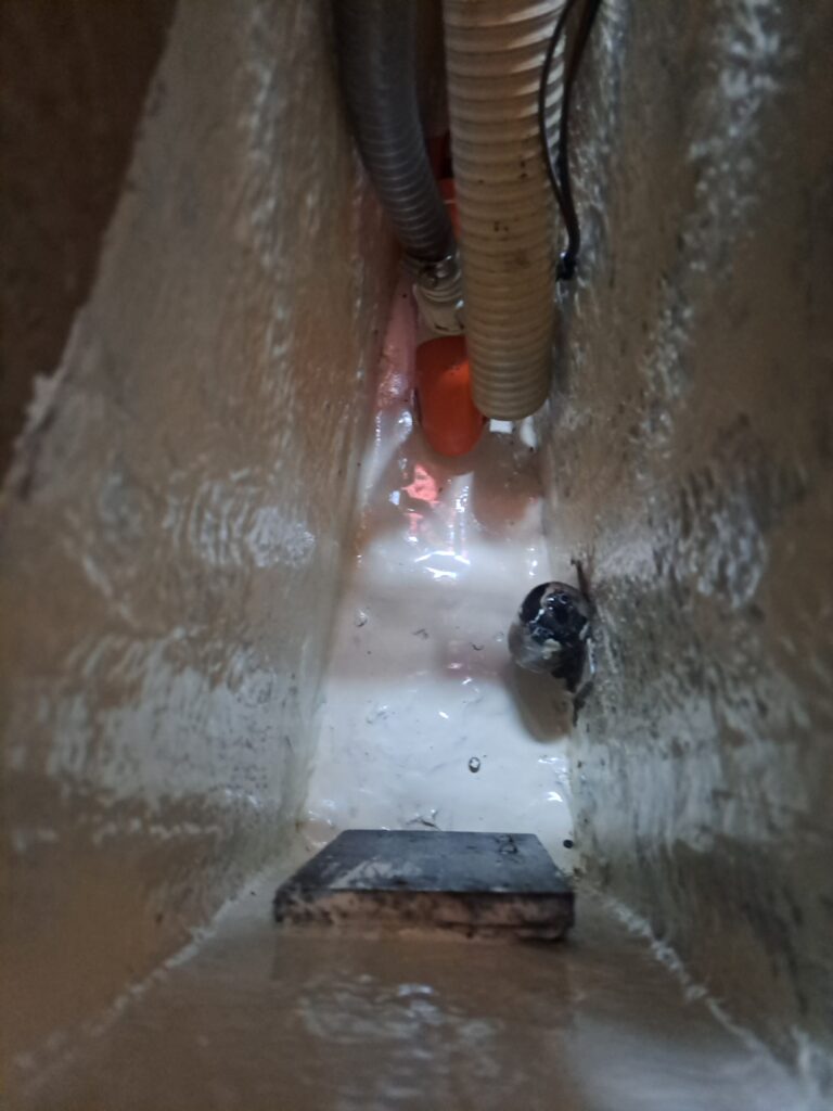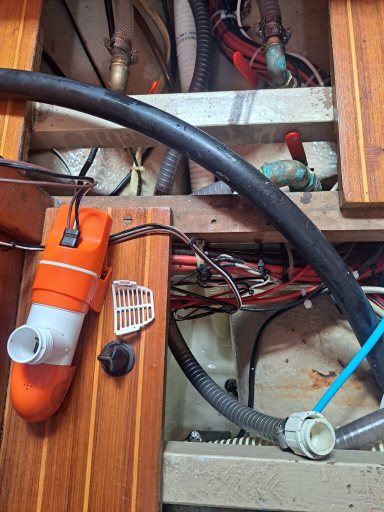 We cleaned the bilge, cleaned the outside of the pump and cleaned the non return valve that is installed at the outlet of the pump. We then dropped several liters of water in the bilge to check that the pump was correctly starting on high level of water in the bilge and that we had good flow going out the through hull.