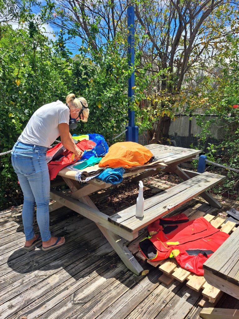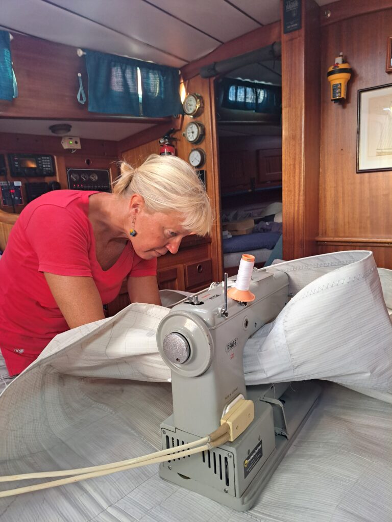 We have been sailing all the way with the cutter sail packed on deck inside its cover when not used. It went all smooth until our sailing to Philipsburg. Although the cover was tied to deck from its ends, a bigger wave probably washed the deck and dragged the middle of the cover with the sail inside overboard. The whole thing hanged in the water until we noticed the issue and lifted it back, but the cover got damaged and needed some repair. We sew an additional loop in the middle of the cover to be able to tie it more firmly on deck.
