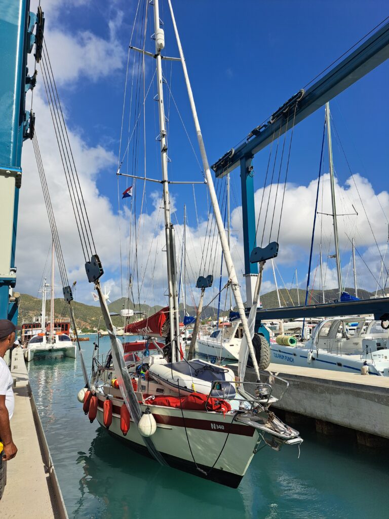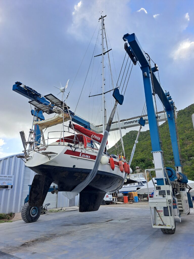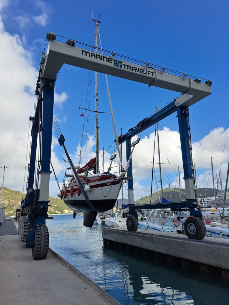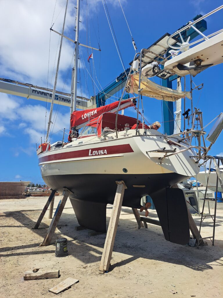 On April 7, we got Lovisa lifted in a boatyard in Philipsburg for a bottom paint refresh and to get the cracks that we had on the pushpit repaired. We took the opportunity to replace the anode on the propeller shaft and the one on the bow thruster. We got the propeller cleaned and painted with new primer and antifouling but that work was done too quickly so there is no chance it will hold …