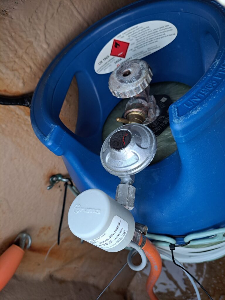 After we bought Lovisa we replaced the gas regulator as part of the preparation for this adventure. We bought a regulator that is fitted with a pressure gauge as it helps to know when the gas bottle is about to finish. Although the regulator is sold for boats, the pressure gauge started to rust very quickly. Salt water also managed to get inside the instrument and the needle got blocked.