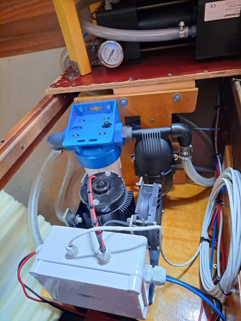 We replaced the fine filter of the watermaker. That was the second replacement since we started to use our watermaker. We also readjusted the pressure in the pressure accumulator located downstream the pump. We also found a small water leakage that we removed.